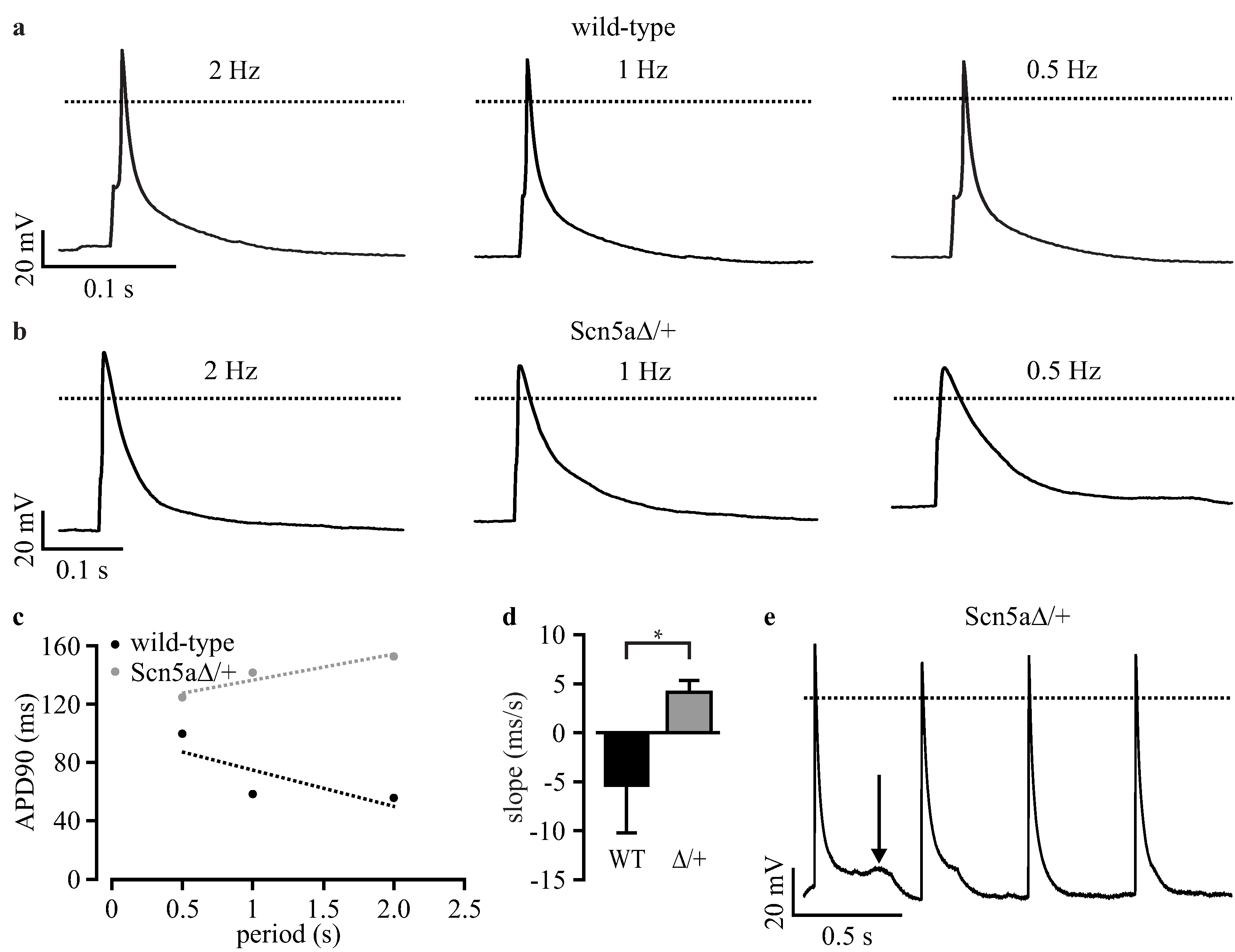 Automated characterization of LQTS 3-specific cardiomyocytes by planar patch clamp. (a,b) Representative traces of APs from wild-type (a) and Scn5a∆/+ (b) cardiomyocytes at high and low pacing frequencies; (c) relationship between APD90 and the pacing period from a representative wild-type and a Scn5a∆/+ cardiomyocyte with analysis of the slope by linear fit (dashed lines); (d) statistical analysis of the slope of APD90 to the pacing period relationship from individual wild-type (WT) and Scn5a∆/+ cardiomyocytes (∆/+); (e) typical LQTS 3-specific EADs observed in a Scn5a∆/+ cardiomyocyte (arrow). Error bars: S.E.M. Dotted lines indicate 0 mV.