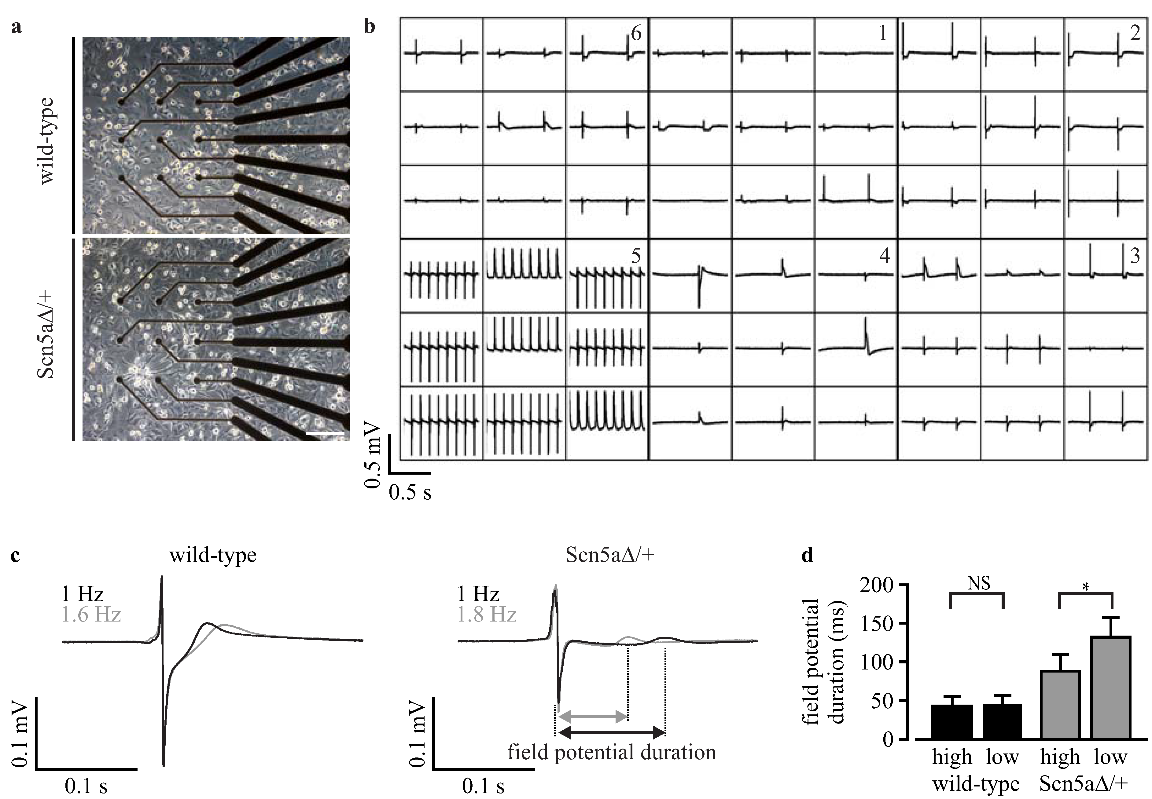The duration of APs can not only be determined by patch clamp analysis, but can also be estimated indirectly from extracellular field potential recordings with microelectrode arrays, because of the good correlation of field potential duration to APD [24]. To prove the functionality of this technology for the characterization of LQTS 3, we plated purified cardiomyocytes obtained from wild-type and Scn5a∆/+ iPS cells on six-well microelectrode arrays on which they formed a monolayer of synchronously beating cells (Figure 6a). This allowed recordings of field potentials from nine electrodes in six individual wells (example recording in Figure 6b). To determine frequency-dependent field potential duration, measurements were performed at 22 °C and at 37 °C, which accelerated the spontaneous beating frequency.
