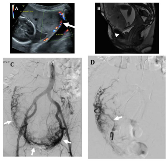 - Baughman, W.C.; Corteville, J.E.; Shah, R.R. Placenta accreta: Spectrum of US and MR imaging findings. Radiographics 2008, 28, 1905–1916. [Google Scholar] [CrossRef] [PubMed]