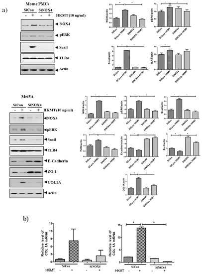 To study of the effect of HKMT on NOX4 production, mouse PMCs and human Met5A cells were incubated with HKMT (10 ng/mL) for 1–6 h. As shown in Figure 1, HKMT treatment increased the expression of NOX4 protein and the production of collagen RNA and protein. Mesothelial cells undergo epithelial to mesenchymal transition (EMT) in the process of tuberculous pleurisy and the transcription factor snail is an inducer of EMT process [20]. The HKMT treatment upregulated snail expression and decreased the expression of epithelial markers, E-cadherin and Zo-1 protein in Met5A cells. The HKMT increased the phosphorylation of ERK 1/2 protein in PMCs. The intensity of DCFA–DA-labeling ROS in the PMCs was also markedly elevated in the HKMT group.