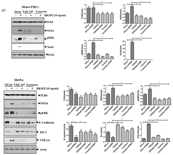 The binding of Ang II to its receptor is associated with intracellular free radical generation and tissue damage [21]. Several studies have suggested that NOX4 plays a critical role in the TLR4 downstream signaling cascade [22,23]. We studied the role of Ang II type 1 receptor (AT1R) and TLR4 in NOX4-mediated collagen synthesis in PMCs after HKMT treatment. Losartan (an AT1R antagonist) and TAK-242 (a TLR4 inhibitor) prevented the HKMT-induced increase in NOX4 and collagen synthesis in mouse PMCs and human Met5A cells (Figure 4a,b). Similarly, both decreased the levels of HKMT-induced DCFA DA-labeled ROS and reversed the EMT process (Figure 4c).