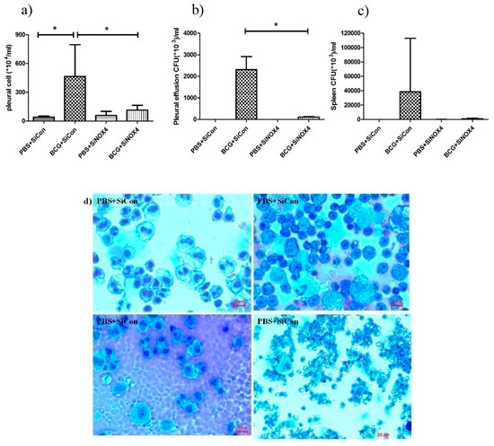 To examine the effects of siRNA NOX4 post-treatment in BCG-induced pleurisy, cell recruitment and the accumulation of cytokines were determined. On day 15 after infection, there was a significant increase in the total number of pleural cells (PBS + SiCon: 40.5 × 104 ± 11.6 × 104/mL, BCG + SiCon: 465.0 × 104 ± 331.1 × 104/mL, p = 0.034) (Figure 8a). The total count in mice in the BCG + SiNOX4 group was significantly lower than that in the BCG + SiCon group (BCG + SiNOX4: 113.4 × 104 ± 51.2 × 104/mL, p = 0.043). We determined the bacterial load in the pleural fluid and spleen. The BCG + SiCon group exhibited substantial bacterial loads in the pleural fluid on day 15 (2313.0 × 103 ± 600.0 × 103 CFU/mL) and BCG + SiNOX4 group depicted significantly lower bacterial loads in the pleural fluid than BCG + SiCon group (BCG + SiNOX4: 110.0 × 103 ± 14.1 × 103 CFU/mL, p = 0.016, Figure 8b).