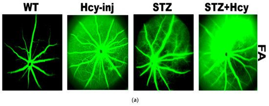 To confirm the link between Hcy and microvascular dysfunction in diabetic retina, OCT and FA were performed in WT and diabetic mice injected intravitreally with Hcy. Consistent with our previous publications [26,27,28,31], in the current study, OCT examination showed alterations in retinal vasculature with neovascularization in both inner (white arrows) and outer retina (yellow arrows), and disrupted retinal morphology, such as sub-retinal fluid accumulation, separation of the retinal pigmented epithelial layer, and thickening of the basal laminar membrane and the choroid, suggesting neovascularization. Also, STZ-injected mice demonstrated decreased vessel integrity and an impaired blood–retinal barrier (BRB), indicated by increased fluorescein leakage as well as disrupted retinal morphology, when compared to the WT mice. Furthermore, to evaluate the changes of the combined effect of elevated Hcy and diabetes on the retina, STZ-treated mice given intravitreal injections of Hcy were subjected to FA and OCT. Hcy-injected diabetic mice showed more deleterious effects on the retinal architecture, decreased vessel integrity and more impairment of the BRB.FA showed increased fluorescein leakage with focal spots of hyperfluorescence, and OCT results showed more distortion in retinal morphology and BRB integrity and neovascularization compared to Hcy-injected and diabetic mice alone (Figure 4).