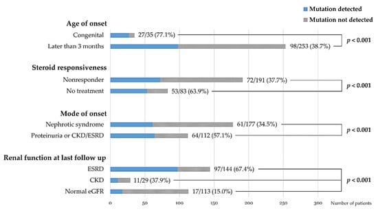 In this study, the mutation detection rate was higher in patients with congenital onset than in patients with other onset age groups (77.1% versus 38.7%, p < 0.001). Previous reports [,,] have shown that the mutation detection rate is inversely related to age at disease onset in patients with SRNS. In a European study [], the mutation detection rates of congenital and infantile NS were 84.8% and 44.1%, respectively (66.3% in the first year combined). Similarly, a previous study [] from our group reported that the mutation detection rates of congenital and infantile NS were 93.9% and 20.2%, respectively (56.7% overall). In addition, a large international cohort study by the SRNS Study Group [] reported the mutation detection rate by onset age as follows: onset in the first 3 months of life (69.4%), between 4 and 12 months old (49.7%), between 1 and 6 years old (25.3%), between 7 and 12 years old (17.8%), and between 13 and 18 years old (10.8%).
