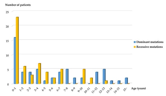Distribution of dominant and recessive mutations by onset age.