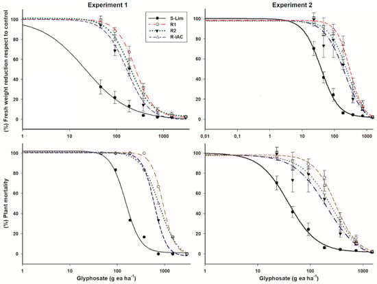 Glyphosate dose-response curves relative to percentages of fresh weight reduction and plant survival of susceptible and resistant slender amaranth (Amaranthus viridis L.) populations collected in citrus orchards from São Paulo State, Brazil. Vertical bars of the fresh weight reduction plots represent the standard error of the mean (n = 6).