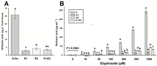 Monitoring the shikimic acid at 96 HAT, the S-Lim population accumulated ~26 µg g−1 fresh weight. This amount of shikimic acid found in the S population was between 6 and 9 times higher than that accumulated in R populations, which accumulated less than 4 µg g−1 fresh weight (Figure 2A). In the in vivo assays, the highest amount of shikimic acid was also found in the S-Lim population that began to accumulate it from the lowest glyphosate concentration (6.4 µg mL−1 at 10-µM glyphosate). The accumulation increased as glyphosate concentrations increased, reaching up ~240-µg shikimic acid mL−1 at 1000 µM glyphosate. R populations began to accumulate shikimic acid only from 50 µM glyphosate; however, such accumulation was much lower than in population S-Lim. At 1000 µM glyphosate, the R1, R2, and R-IAC populations accumulated 16, 43, and 33 µg shikimic acid mL−1, respectively (between 5.6 and 15 times less than the S-Lim population) (Figure 2B).
