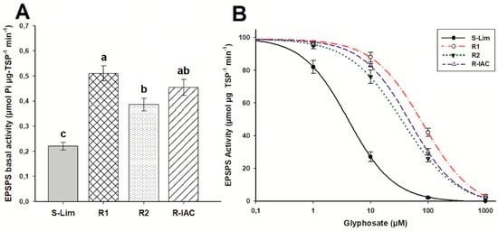 EPSPS (5-enolpyruvylshikimate-3-phosphate synthase) activity in glyphosate-susceptible and -resistant slender amaranth (Amaranthus viridis L.) populations collected in citrus orchards from São Paulo State, Brazil a. (A) Basal EPSPS activity (absence of glyphosate). Same letter above bars are not different using the Tukey test at 95%. (B) Dose-response curves of the EPSPS enzyme activity, expressed as a percentage of the untreated control, exposed to different glyphosate concentrations (µM). Histograms represent the means, and vertical bars the standard error (n = 3).