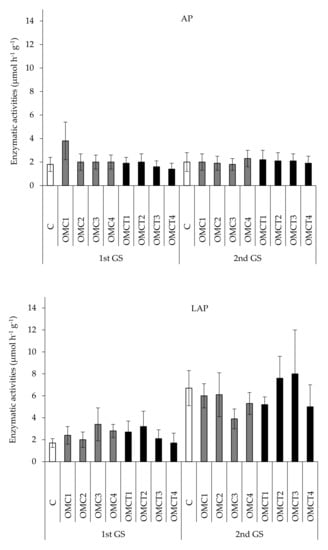 An unexpected result was the lack of effect of any treatment on microbiological activity, as the addition of compost usually increases soil enzymatic activities [40]. In addition, compost tea is ex-pected to have higher microbiological activity than compost [18]. However, this was not the case of this study. Soil enzymatic activities were already high in the soil study sites compared with OMC, which may have contributed to a small effect of any dose on soil activity. The increase in POX (i.e., an enzyme related to organic matter oxidation) during the second growing season may possibly be explained by the increment in moisture and OM, derived from compost incorporation and onion growth.