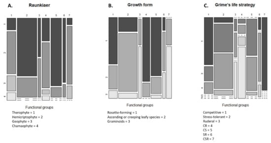 The traits included in the analysis were chosen specifically for our research objectives, which were Raunkiaer life form (RLF), growth form (GTF), Grime’s life strategy (GLS), specific leaf area (cm2·g−1) (SLA), plant height (m) (PLH), seed weight (mg) (SWT), duration of flowering period (months) (DFF), seasonality of germination (SSG), and affinity to soil nutrient conditions (SNC). Detailed traits descriptions can be found in Table A2 (Appendix A).