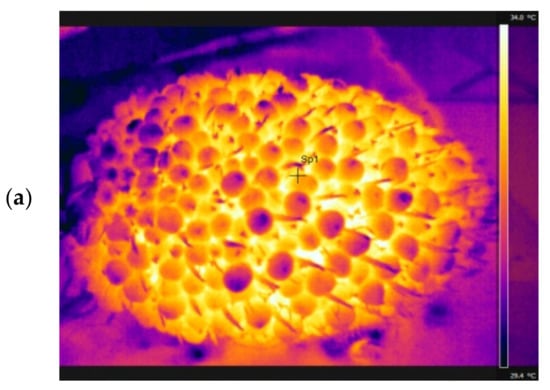 Thermal imaging has been used for different applications in agriculture, especially in pre-harvesting and post-harvesting processes [21]. Assessment of seedling viability, estimation of soil water status, estimation of crop water status, irrigation scheduling, identification of diseases and pathogenic plants, estimation of fruit yield, and ultimately, evaluation of the maturity of fruits and vegetables are a few applications of thermal imaging in agriculture [22]. Many researchers have investigated thermography and its role in evaluating the maturity of fruits. In this regard, [23] utilized infrared thermometry to assess the maturity of persimmon, pear, and tomato. They categorized the collected samples into the following three grades: immature, mature, and over-ripe. To do so, color, firmness, and sugar content were taken into account. Since the difference in surface temperature during maturity stages was small, the samples were stored at high (30 °C) and low (5 °C) temperatures for more than 24 h. The surface temperature of immature fruits kept at a lower temperature appeared to be somehow higher than that of mature and over-ripe fruits, and the surface temperature of immature fruits kept at a higher temperature appeared to be somehow lower than that of mature and over-ripe fruits. They claimed that “the heat generated in metabolic processes of fruits and vegetables influence surfaces temperatures of the samples”. The authors of [21] used a commercial infrared thermal imaging camera (VARIOSCAN 2011) to particularize the maturity of two varieties of apples. Their findings indicate that as the degree of maturity increases, the surface temperature of the samples will increase as well. Interestingly, transpiration turns out to decrease during this interval of the fruit ripening process. For fruit maturity estimation, infrared technology can be used to classify the whole fruit into immature and ripe states without considering the color of the fruit. This comes from the fact that ripe fruit have higher heat capacity, and therefore, their body temperature slowly changes [24]. Evaluation of maturity is considered to be highly crucial in pre-harvest and post-harvest stages. Despite the fact that there are a number of automatic methods in this regard, visual inspection is a necessity, and it is implemented in many parts of the world [25]. The temperature of the fruit is determined according to transpiration, metabolic heat, and water exchange with the atmosphere [21]. It is a fact that transpiration occurs in fruits during ripening and storage. As a result, it would be possible to recognize temperature differences in ripening stages via thermography techniques. The authors of [24] applied two techniques, namely thermal imaging and NIR imaging, to assess the maturity of a particular type of mango. In a similar vein, the authors of [26] utilized a thermal imaging camera (called the AGEMA 880 LWB) to highlight the differences in thermal properties that exist between apples with and without an affected water core. It should be noted that the affected area, in this case, was the tissue. The aforementioned camera is sensitive within the spectral range of 8–13 μm.