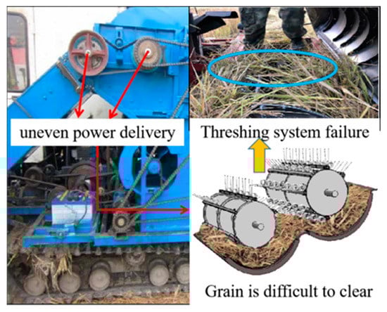 When the threshing drum is blocked, it is mostly due to its too slow rotation speed or too large growth density of grains [], which makes the operating parameters do not match or the fed grains cannot be threshed. As a result, the entanglement of the grain and the threshing system and then seriously affects the harvesting efficiency of grain []. Shin et al. divided the common failures of combine harvesters into header failures, threshing system failures and re-trippers failures, then proposed relevant measures to prevent and reduce failures []. Pavlyuk et al. analyzed the main system performance parameters of the combine harvester, pointed out that the failure parts of the combine harvester are mainly concentrated in the harvesting part and the threshing part []. Wang et al. collected the vibration signal of the shaft end of the threshing drum by a wireless vibration sensor, and the Hilbert-Huang transform analysis method was used to analyze and process the signal to obtain the blockage process of the threshing drum. The time-spectral characteristics of the combined harvester predict its blocking trend, so as to adjust the combine harvester’s travel speed to avoid blocking []. Kumar et al. used vibration sensors to collect vibration signals of rotating machinery, and analyzed the spectrum of the obtained signals through signal processing technology to determine the severity of component vibration to propose failure prediction methods [,].
