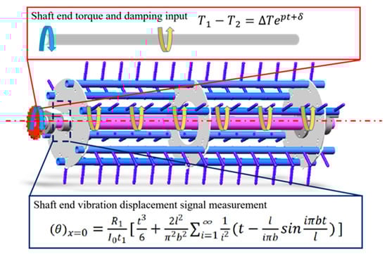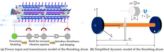 In this paper, dynamic model are carried out based on the working characteristics of the threshing drum. Figure 2 shows the simplified model of the threshing drum transmission. For this purpose, when the length of the threshing drum is l, let the symbol  denote the amount of rotation (about the axis of the shaft) of any cross-section located at a distance from the left end. When the shaft vibrates in a torsional manner, the elastic and inertial torques on a typical segment can be calculated linearly according to D’Alembert’s theorem [,].
