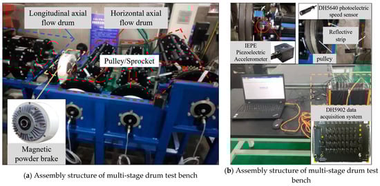 In order to verify the accuracy of the characterization model established in this paper for the fault signal of the threshing drum and reveal the influence of different working conditions (different grain loads or different rotational speeds of the threshing system) on the vibration performance of the threshing drum. A comprehensive test bench of multi-stage threshing drum was built to verify and evaluate the vibration performance of the threshing drum [,,]. The built multi-stage threshing drum test bench is shown in Figure 4.