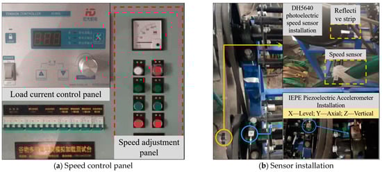 The magnetic powder brake used in this test bench is FZK50 from Nantong Hongda Electromechanical Manufacturing Co., Ltd. (Nantong, China) When the electromagnetic coil is energized, the magnetic powder particles are subjected to the magnetic force. It attracts and gathers together to form a whole, so as to transmit torque. For measurement, choose IEPE piezoelectric acceleration sensor, the rotational speed sensor is used to measure the rotational speed change of the threshing drum, choose DH5640 photoelectric rotational speed sensor, the installation method of each sensor is shown in Figure 4b.