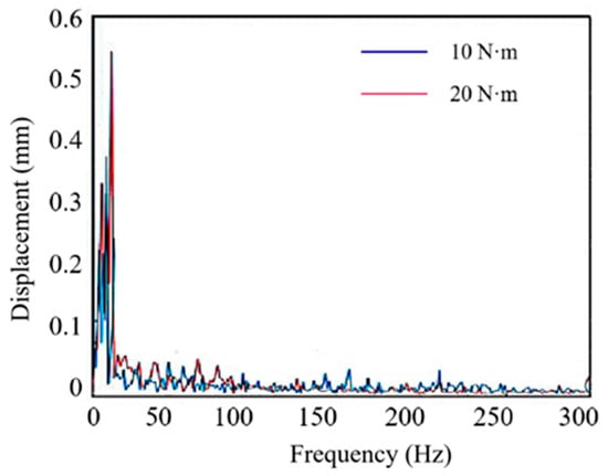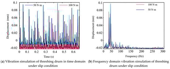 When the threshing drum slips, its rotational speed will be significantly reduced, so the torque at the input end will also decrease accordingly. In this experiment, two different input torques, 50 N·m and 100 N·m are designed, of which 50 N·m simulates slippage and 100 N·m was used as the control group for comparative analysis. Therefore, in the corresponding model, the vibration characteristic signal of the threshing drum in this state can be solved with the help of Equations (17)–(21). The time domain displacement of the threshing drum bearing in the Z direction can be calculated and extracted with the help of MATLAB. After FFT transformation, the vibration response state of the threshing drum can be obtained through the solution, as shown in Figure 6.