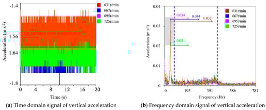 In addition, with the increase of the rotation speed of the threshing drum, it can be seen that the vibration acceleration of the threshing drum in the frequency domain increases under the working conditions of 632 r·min−1 to 695 r·min−1, the vibration acceleration decreases significantly at 725 r·min−1. For the change of the vibration amplitude of the threshing drum, the acceleration signal is further processed by quadratic integration to obtain the time domain diagram of the displacement signal, and FFT is performed on it to obtain the frequency domain diagram of the displacement signal. The results are shown in Figure 9.