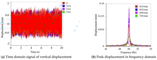 It can be seen from Table 4 that with the increase of the rotational speed of the drum, the acceleration in the Z direction of the drum shaft end also increases. The maximum displacement is about 0.3 mm, but it can be seen that the maximum displacement in the Z direction increases first and then decreases slowly. When the speed is lower than 725 r·min−1, the peak displacement increases gradually, and when it reaches 725 r·min−1, the peak displacement decreases obviously. It can be seen that the frequencies when the peak displacement is reached at different speeds are all around 50 Hz.