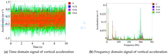 This test mainly analyzes the collected acceleration signals of the drum shaft end. Figure 10 is the time domain signal of the acceleration of the drum shaft end in the Z direction. It can be seen from Figure 10b that when the threshing drum has a tendency to block, the average acceleration in the Z direction increases from 0.088 m·s−2 to 0.150 m·s−2, the increase is more obvious. When the torque continues to increase, the average acceleration in the Z direction decreases from 0.150 m·s−2 to 0.071 m·s−2, showing a decreasing trend as a whole. The low frequency part is about 0–195 Hz and the high frequency is about 586 Hz, and the peak acceleration also increases with the increase of the load.