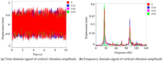It can be seen that at the resonance point of the threshing drum, due to the low tangential stiffness, the vibration amplitude there will reach the maximum value. At the same time, it can be seen that at the low frequency of 50 Hz, there is an obvious vibration characteristic peak, indicating that the vibration energy of the threshing drum is mainly concentrated in the low frequency. The displacement fluctuations in the Z direction in the time domain are more obvious, and the fluctuation range is at −0.2 mm–0.1 mm.