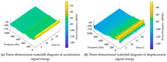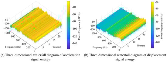 Figure 13 is the energy distribution diagram of the acceleration signal and the displacement signal. It can be seen from the energy distribution diagram of the signal that whether it is the acceleration signal or the displacement signal, their energy is mainly concentrated in the low frequency part, which the energy in the Z direction of the drum shaft end is mainly 50 Hz. The three-dimensional diagram of the acceleration signal and the displacement signal can be more intuitively express the energy distribution of the slip condition. With the change of time, except for the small amplitude jump at a few time points, the tracking trajectory of the peak frequency is stable.