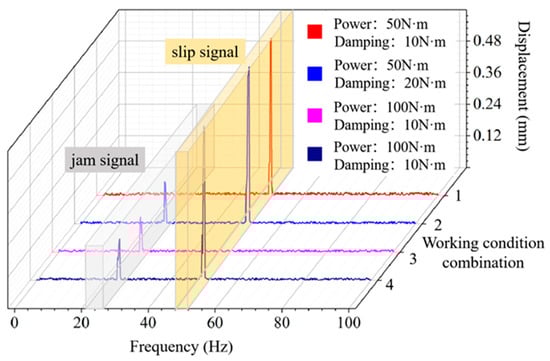 This paper analyzes the vibration state of the threshing drum under the interaction, as shown in Figure 14. Under different combined working conditions, the vibration of the threshing drum shows obvious anisotropy. When the blockage occurs, the main component of the vibration of the threshing drum is concentrated at about 50 Hz, the peak displacement of the vibration is about 0.18 mm; when the load increases, the vibration amplitude increases significantly. When a slip fault occurs, the fault frequency is mainly concentrated at about 50 Hz, the peak displacement of the vibration reaches about 0.55 mm. With the increase of the input power, the vibration amplitude decreases significantly. When the disturbance load on the system is too large or the power input is too low, multiple failures may occur, as shown in working conditions 2 and 4 in Figure 14. It can be obtained that the energy of the vibration is mainly in the low frequency band, and the resonance frequency increases due to the increase of the damping when the block is blocked, so that the frequency of the large vibration is shifted backward.