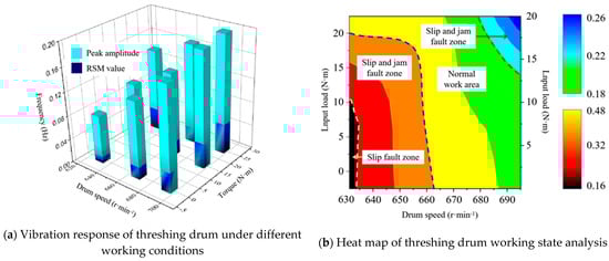 (1) A mathematical model based on the vibration of the shaft end of the threshing drum is established. It is clarified that under different power and load inputs, the different vibration response states exhibited by the threshing system as well as the characteristic signals in the frequency domain. The results show that when the threshing drum fails, vibration energy is in the low frequency band (below 50 Hz), the peak vibration displacement can reach 0.184 mm when it slips and the peak vibration displacement can reach 0.55 mm when it is blocked.