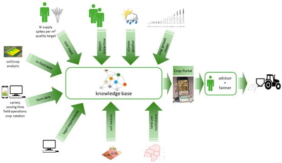 In the Crop Portal, farmers and advisors can view crop information for individual fields from heterogeneous data sources at a glance. Through in-depth literature research and interviews with crop consultants and farmers, a requirement profile for a DSS for N management of winter wheat in arable and mixed farms was created. A prototype was implemented, tested, and evaluated, with positive results. Structured discussion of fertilizer requirements and the associated sensitization of the users to relevant considerations and input variables resulted in a transfer of knowledge and improved decisions. In this way, farmers benefit from the digital ‘social capital’ [], i.e., knowledge of the digital expert network, cf. [,,].