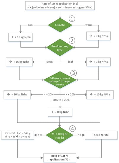 Possible fertilization strategies were linked to the patterns of the two modeled advisory decision trees. The optimization objective for all decision trees was maximum N use efficiency (NUE) = N output/N input. One of the decision trees for determining the rate of application (RoA) (kg N ha−1) for the 1st application is explained in more detail below (Figure 2).
