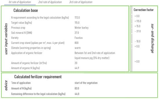 Figure 3 shows the output variables relevant to the 1st RoA together with the summarized input variables. The N requirements, determined according to the legally prescribed fertilizer requirement calculation [], the previous crop, the SMN content, and the variety were queried from the knowledge base or connected external services (e.g., LKP soil information portal, record keeping software). For the crop stand density and the climate, as well as other parameters, the surcharge and discharge are displayed. The application of organic fertilizer has already been recorded as planned. As this application takes place between the 1st and 2nd application, the consultant does not consider any N effects expected when calculating the 1st application. The overall recommendation shown is an application of 83 kg N ha−1 at the beginning of vegetation. The timing depends on the crop stand density and the N supply of the crop at the time of calculation, the currently reached growth stage, and the weather forecast (displayed graphically but not processed automatically). According to the legal N requirement calculation (maximum RoA), a maximum of 44 kg N ha−1 may still be applied in the field. In this case, the planned organic N fertilization is already considered, with the recommended rate of mineral N application as an optional parameter (type of organic fertilizer, amount, and application date). The information enables the farmers to check its strategy ad hoc and to plan ahead.