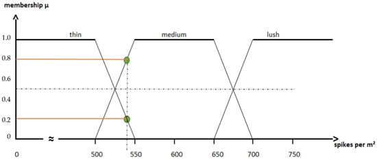 In the examples presented, attribute X has a uniquely assigned value. As a result of these limit values, there is no smooth transition between the systematization boundaries. In the future, such fuzzy variables (‘lush crop stand’) could be given relative weightings via a fuzzy membership function stored in the system, and thus, human thinking would be better represented []. Similar approaches have already been used to calculate the total amount of N applied in a season [], including in milk and meat production []. An increase or reduction in the recommended application rate is, therefore, calculated proportionally, depending on the strength of the criterion. In the case of the variable ‘crop stand’ (Figure 4), intervals are defined in which a certain crop stand density is assigned as ‘thin, medium, or lush’. However, these intervals overlap, gradually increasing or decreasing, and there is a core interval where 100% affiliation is seen. Thus, a crop stand density of 540 spikes per m2 would have an affiliation µ of 0.2 to a ‘thin’ stand density and µ of 0.8 to a ‘medium’ density. The addition or deduction of the recommended amount of N required for this crop stand density can then be determined, for example, using a weighted average or other defuzzification methods: N surcharge at 540 spikes per m2 = 0.8 × 0 kg N + 0.2 × 10 kg N → 2.0 kg N ha−1.