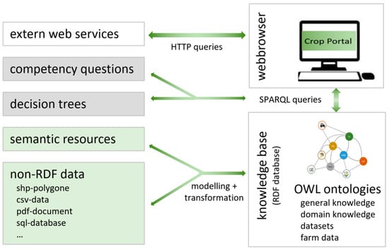 Figure 5 shows a schematic of the developed DSS. From existing semantic resources, such as ontologies available online, vocabularies (e.g., AGROVOC and QUDT), SPARQL endpoints, and non-RDF data sources (e.g., DWD raster maps, BBCH monograph [], fertilization guidelines, and regulations), several OWL ontologies have been created using different software tools (e.g., Protégé, Ontop, and GraphDB OntoRefine) []. Here, the individual ontologies contain the modeled data structures, general and specialized knowledge, transformed datasets from data sources from different institutions, and farm data from individual model farms. The OWL ontologies are loaded into the central knowledge base of the DSS for storage, further processing, and querying. The knowledge base is an RDF graph database with an automatic reasoner that can infer additional facts from existing knowledge via semantic vocabulary []. The competence questions and decision trees are formulated as SPARQL queries so that they can be answered by the knowledge base [].