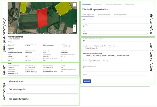 In cooperation with three consultants and one to three model farms each, implementation of the prototype arable farming portal, including the graphical UI, was tested under practical conditions for the use of N fertilization of winter wheat. The implementation was subsequently evaluated using a standardized questionnaire. Additionally, the calculated nutrient quantities were compared and validated with the actual courses of action and recommendations. The cooperating farms in Lower Bavaria (Gäu, Danube, and Inn valleys), Swabia (Tertiary Hill Danube-South), and Upper Palatinate (decompositioned soils in the highlands, East Bavarian Hill) represented different soil–climate areas in Bavaria []. The desired conditions of the model farms (crop diversification, fertilizer regime, farm size, field size, with/without livestock, etc.) supported the derivation of parameters that were as ‘universal’ as possible so that a diversity of farms was represented.