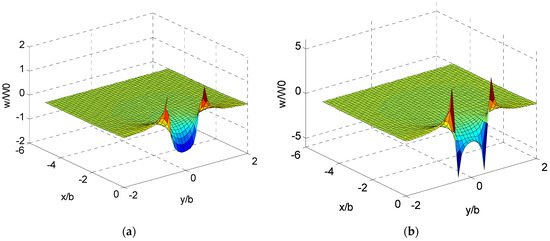 For both elliptic and rectangular lift distribution, the downwash flow region becomes narrower but its value is greater when it draws closer to the wing, because the distance between this region and the vortex core gets shorter. From the intersection points in Figure 4c,d, one can resolve locations of vortex cores are at y = ±0.43b (elliptic lift) and y = ±0.5b (rectangular lift), where the precise location measured in [8] is y = ±0.39b and y = ±0.5b for elliptic and rectangular lift, respectively. Meanwhile, it is found that the rectangular lift generally tends to induce greater velocity than the elliptic distribution given the same factor W0. Therefore, an agricultural aircraft with rectangular lift is preferred in aerial spraying and the nozzles should be mounted within the downwash flow region.