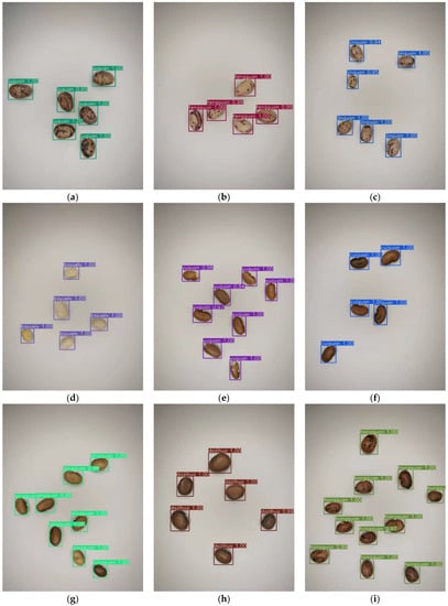 Deep learning is a process that mimics the learning of the human brain, and it originates from artificial neural networks [9]. Deep learning can extract the features of an image through multiple convolutional layers to classify the image. Currently, deep learning is widely used in agriculture to classify crops. In [10,11,12], various popular and improved classification networks for deep learning are applied to the task of classifying maize seeds, wheat seeds, and other seeds. Although all of these methods can achieve high accuracy rates, most of the research on seed classification uses image classification networks via deep learning. The image classification network classifies the entire image as a single label. The output information of the network also involves only the class information of the seeds. This method can complete the classification when there is only one class of seeds in one image. To adapt dynamic inspection on the conveyor and improve efficiency, multiple classes of seeds can be classified simultaneously in one image [13,14]. In comparison to classification networks, detection networks in deep learning practices separate the selected targets from the background. The target-detection network assigns class and location information to the selected targets. In this way, each seed can be selected, and each seed can present class and location information. By the target-detection method, multiple classes of objects in an image can be successfully classified [15,16,17,18]. Among the target-detection algorithms, Yolov3 belongs to the single-stage target detection algorithm [15]. Considering the requirement for speed and accuracy, the present study used the Yolov3 algorithm for the detection of kidney bean seeds.