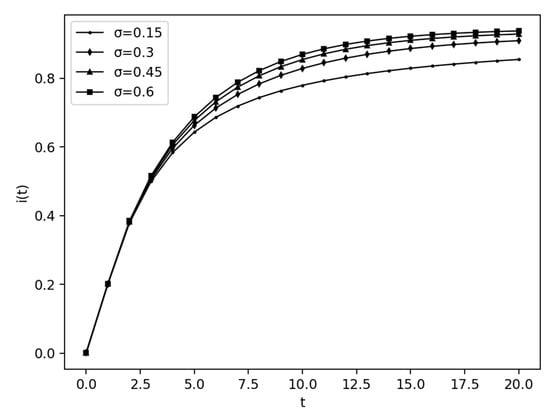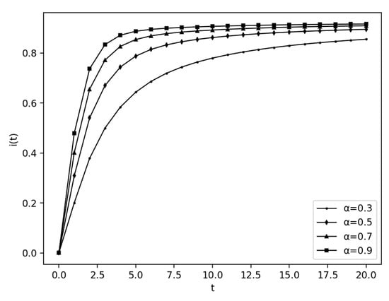 Farmers who understand service information as well as have the intention to sign contracts are the keys to expanding the scale of an AGPSS. When the direct immunization rate of latent persons is greater than that of infectious persons, the transmission threshold will increase with the increase in α, which is conducive to the transmission of service information. The value of α is increased from 0.3 to 0.5, 0.7 and 0.9, respectively, and the change in accepted service customer I is shown in Figure 3. It can be seen that the larger the α value, the higher the stable value of i and the shorter the time to reach a steady state.