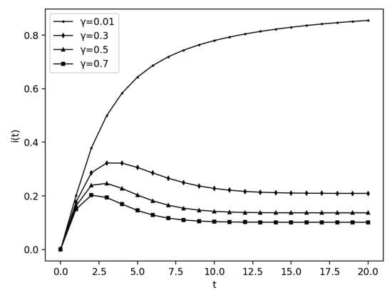 Given the frequency, unpredictability and impact intensity of agricultural production risk outbreaks, this study further simulates the impact of major risks on the formation and diffusion of an AGPSS network. According to the Model Text of Agricultural Production Trusteeship Service Contract issued by the General Office of the Ministry of Agriculture and Rural Affairs of China, the parties of the contract need to agree on the average crop yield per mu or the income per mu. If the agreed yield or income is not reached, the two parties will negotiate the compensation amount or specific compensation method. When natural disasters affect production and income, if service providers cannot pay or bear farmers’ losses in time, they will directly affect the farmers’ decision to renew their contracts, leading to farmers’ refusal to renew their contracts, which is manifested as a significant increase in the immune conversion rate γ in the model. The value of γ was increased from 0.01 to 0.3, 0.5 and 0.7, respectively, and the change in the quantity ratio of contracted farmer I is shown in Figure 4. It can be seen that the larger the γ value, the faster i reaches the peak and falls back to a stable state, but both the peak value and the stable value decrease with the increase in the γ value. Due to the robustness of the scale-free network, there will still be a certain proportion of contracted farmers without affecting the income of most farmers.