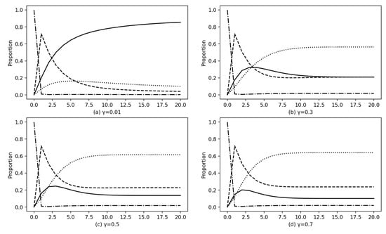 γ is the cure rate, representing the probability that farmers who are adopting AGPSS will refuse to renew their contracts. The value of γ mainly depends on the duration of a single contract and the ability of both supply and demand to withstand the impact of agricultural production risks. Too long a single contract period is not conducive to the acceptance of farmers, while too short a single contract period is not only conducive to the sustainable use of land, but also harms the interests of service subjects. Agricultural production risks affect farmers’ income, and sudden drops in output and income will inevitably affect farmers’ contract renewal behavior, resulting in a relatively high γ. The service subjects whose responsibility is the green transformation of agricultural production can obtain government support and subsidies to offset the contract cost of farmers. Their ability to resist risks will be relatively strong, which is conducive to the dissemination of service information, and they will attract more loyal farmers and further promote the coverage of AGPSS.