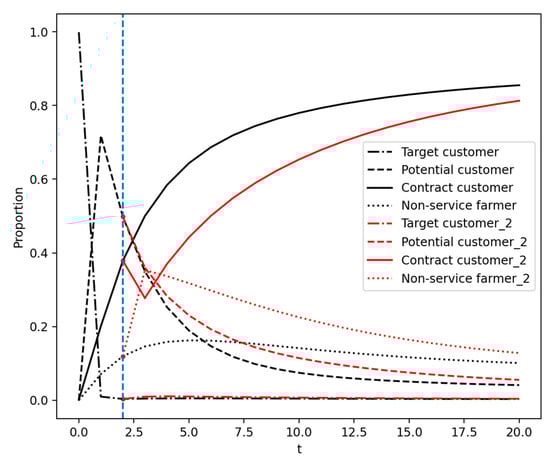 As can be seen from the above results, this paper assume that the target customers are equally affected by potential customers and contracted customers . Because the service subject provides timely feedback on the opinions of farmers and updates the service content, the probability of potential customers refusing to sign contracts is greater than the probability of contracted customers refusing to renew their contracts ; then, . This means the transmission threshold increases with the increase in the signing rate, which is conducive to the transmission of service information. Since the service subject is backed by large enterprises and the service pricing is reasonable, the cost of the farmers’ choice to produce social services is lower than the other decisions. So, the probability of potential customers refusing to sign contracts is smaller than the probability of contract customers refusing to renew their contracts ; then, . This means the transmission threshold decreases with the increase in the signing rate. Increasing the transmission ratio of potential customers will lower the threshold for AGPSS information to spread. This is not conducive to the spread of AGPSS network.