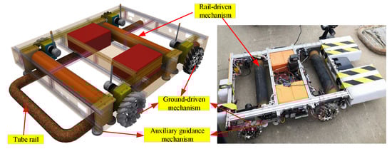 The vehicle chassis primarily comprises two components: the driving mechanism for flat ground and the tube rail. The driving mechanism of a intelligent vehicle typically involves two aspects: wheel-driven and roller-driven. The wheel-driven mechanism is primarily used for operation on horizontal ground and is achieved by installing four mecanum wheels on the chassis. Conversely, the roller-driven mechanism is primarily used for operation on rails and is achieved by installing two rollers on the chassis. The system structure of the driving mechanism is depicted in Figure 1.