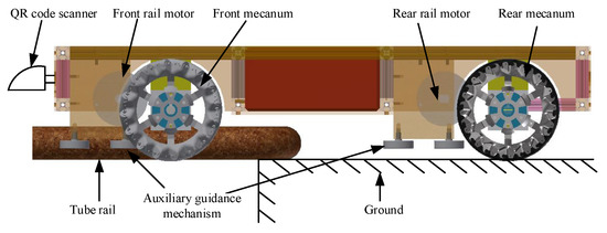 To ensure the smooth operation of the intelligent vehicle on the rail, the roller-drive device primarily consists of two roller drive mechanisms and two pairs of guide wheels. The driving motor of the roller driving mechanism is installed inside the roller. When the vehicle operates on the road surface, the rotating roller is elevated above the ground. As the vehicle moves onto the rail, the roller is placed on the rail, as illustrated in Figure 2. A pair of guide wheels is installed at the front and rear ends of the two rollers. This installation method enables the roller drive mechanism to adjust the vehicle’s attitude before the railing, ensuring effective railing for the roller drive mechanism. As the rear roller successively contacts the rail, friction between the roller and rail contact surface ensures the intelligent vehicle runs smoothly on the rail. The two pairs of guide wheels not only help with vehicle railing but also prevent the vehicle from overturning or derailing on the rail.
