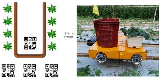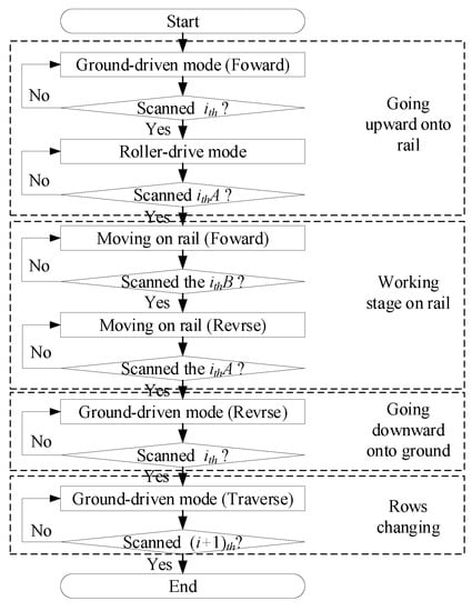 A complete workflow intelligent vehicle of can be divided into four stages: moving upward onto the rail, working on the rail, moving toward the ground, and row changing, as depicted in Figure 6. When the scanner scans the QR code with ith at the front of the rail for the first time, it indicates that the vehicle will go upward onto the rail. The mecanum wheels drive the vehicle, and the rollers begin rotating towards the rail. When the vehicle scanner scans the QR code with ith A at the beginning of the rail for the first time, it indicates that the vehicle has completed the action of moving upward onto the rail. The mecanum wheels are stops. The vehicle begin to work on the rail. The QR code ith B located at the end of tube rail indicates the direction in which the vehicle is moving. When the vehicle scanner scans the QR code with ith A for the second time, it means that the vehicle will go downward onto the ground. The rollers continue rotating, and the mecanum wheels start moving downward on the rail. By the time the vehicle scanner scans the QR code ith for the second time, the vehicle has completed the action of going onto the ground. At this point, the plant-protection vehicle stops the rotation of mecanum wheels and rollers. Next, the vehicle moves laterally, starting the rail change operation and entering the next rail to work.