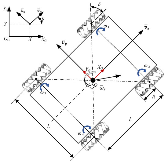 where m is the total mass of the plant-protection vehicle; is the moment of inertia of the vehicle in z-axis direction; is the moment of inertia of the mecanum wheel; and is the angular velocity of the ith mecanum wheel.