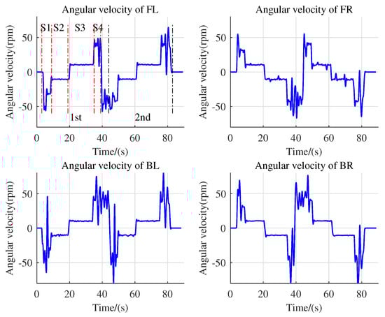 As shown in Figure 7, when the vehicle scans the QR code ith for the first time (t = 3 s), it enters the stage of moving upward onto the rail (S1). The vehicle controller sends the command to go upward onto the rail and sets the motor speed to 50 rpm. The FL and BL motors rotate in the opposite direction, while the FR and BR motors rotate in the forward direction. By 5 s, the motor speed reaches 50 rpm and the intelligent vehicle moves straight. After about 2 s, the FL and FR wheels of the vehicle are suspended, while the BL and BR wheels are not yet on the rail, resulting in a large velocity overshoot. After the vehicle scans the two-dimensional code ith A (t = 9 s) under the rail for the first time, it enters the stage of forward driving on the rail (S2), where the entire vehicle is on the rail and all four mecanum wheels are in a suspended state, with all the motors stopped rotating. However, due to control noise and error, the motors still have some residual speed. The vehicle is driven by the roller motor at this point. After operating continuously for about 10 s, the controller sends an instruction for the vehicle to reverse, entering the reverse driving stage on the rail (S3). At this stage, the mecanum wheels are still in a no-load condition on the rail, with a certain speed due to the influence of control noise and error. When the vehicle scans the two-dimensional code ith A (t = 35 s) in the rail for the second time, it enters the stage of moving toward the ground (S4). First, the BL and BR wheels of the vehicle make contact with the ground, followed by the FL and FR wheels.