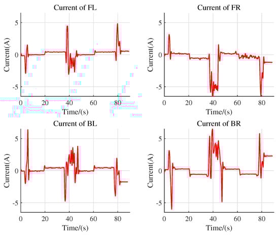 Figure 7 and Figure 8 illustrate the changes in velocity of the mecanum wheels and the current of the motor during the process of vehicle moving up and down the rail. The entire test process was carried out to include the automatic rail change, as well as the two times of moving up and down the rail, as marked in the FL wheel velocity diagram. The analysis process for the velocity change of the other wheels is the same as that of the FL wheel.
