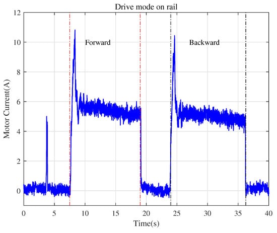 Figure 9 shows the current changes of the roller motor during the mobile vehicle’s movement on the rail. At the beginning of the vehicle’s upward motion onto the rail stage, the roller motor was not rotating, and the driving force of the vehicle was provided by the mecanum wheel. Around 6 s into the process, the roller motor started to rotate, and the vehicle moved steadily on the rail. The driving current at this stage was approximately 5.5 A. After moving forward for about 10 s, the vehicle began to move backward (t = 21 s). As the vehicle scanned the two-dimensional code ith A again, the roller motor stopped rotating, and the vehicle started the downward motion onto the ground stage, which was driven by the mecanum wheel. It can be seen from the figure that the maximum current was about 11 A at the start of the roller, mainly to overcome the inertia force of the vehicle.