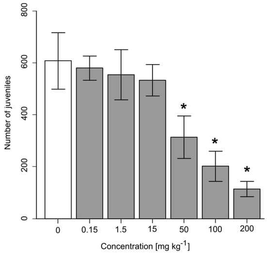 Two sets of experiments were performed in parallel. First, the reproduction test according to the standardized test guidelines [,]. For the reproduction test, 10 synchronized juveniles (10–12 days old) were introduced into each test vessel containing 30 g artificial soil and dried baker’s yeast. Water (60% WHC) and food content were replenished weekly. After the end of the exposure time organisms were extracted using the Tullgren extraction method, and surviving adults and juveniles were counted.