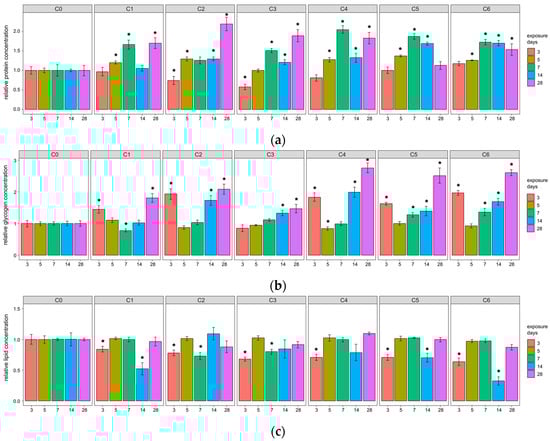 Glycogen concentrations varied with time of exposure as well as with AZO concentration, showing an interesting “U” shaped temporal response (Figure 2b). Initially, after 3 days of exposure, glycogen levels increased compared to the control at all tested concentrations (except C3), with the highest increase at C6 (97.2% increase). After the initial increase, glycogen concentrations started to return to the control values (5 and 7 days of exposure), and then again, they significantly increased after 14 and 28 days. Values were, on average, 2.5 times the values in the control at concentrations C4, C5, and C6.