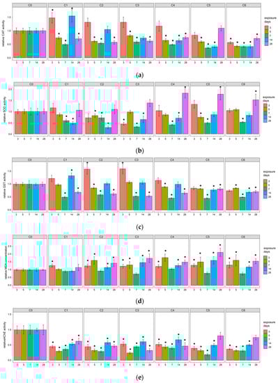 After 3 days of exposure, an increase in CAT activity was observed at lower, environmentally relevant AZO concentrations (C1, C2, and C3), although only the increase at C1 was significant (Figure 3a). At C4 and C5, catalase activity remained at control levels, while it was strongly inhibited at C6 (43.11%). Furthermore, induction of CAT occurred after 14 days of exposure at C1. However, at all other time points and concentrations, catalase activity was strongly inhibited compared to the control values.