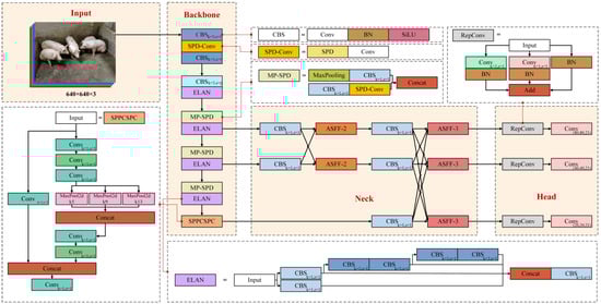 where , , and refer to the spatial weights of the feature of three different levels for level . A stage-specific number of adaptive spatial fusion modules is implemented due to the discrepancy in the number of fused features at each stage of the AFPN. In this paper, extra convolutional layers are added to the AFPN for the better extraction of features. In conclusion, AFPN can gradually integrate features from different scales, in order to better understand the pig features in complex environments. At the same time, the adaptive spatial fusion mechanism can adjust attention according to different situations, better handling pig information in complex backgrounds.
